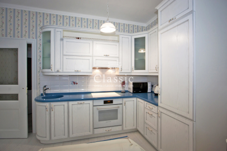 Гарнитур «Афина» изготовлен в классическом стиле с нарочито роскошным оформлением фасада резьбой, стеклянными вставками и изящными металлическими ручками на дверцах. Светлые тона делают дизайн сбалансированным, а также позволяют сочетать предметы мебели практически с любыми оттенками в интерьере.