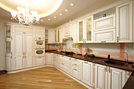 Кухня Монтебьянко Аргенто из массива выполнена в колониальном стиле. Бело-серебристая гамма дополнена воздушными ручками из матового металла. Красивое и словно запотевшее стекло шкафчиков прямой и изогнутой формы украшено нежными цветочными виньетками. Ни один миллиметр пространства здесь не потерян впустую. Для распределения секций хранения использовано даже пространство у потолка и модуль, за которым спрятана вытяжка. Открытые полки с бортиками предназначены для коллекционного фарфора. В столешницу с резным экраном интегрирована глубокая раковина и варочная поверхность плиты. Гарнитур можно устанавливать вдоль одной стены или воспользоваться угловым планировочным решением.
