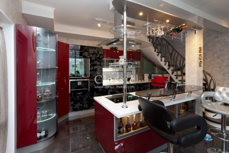 Изысканная кухня Монро в стиле хай-тек выполнена из акрила. Фасады выдержаны в сочной красно-белой гамме и дополнены вставками под дорогую древесину пепельно-шоколадного оттенка. Изящный сверкающий кант и фото знаменитой Мэрилин – изюминка дизайнерского проекта. Здесь царит ощущение настоящей роскоши! Впечатление только усиливает нестандартное оформление и обилие дымчатого стекла, хромированного металла. Это воплощение гармонии стиля и практичности!